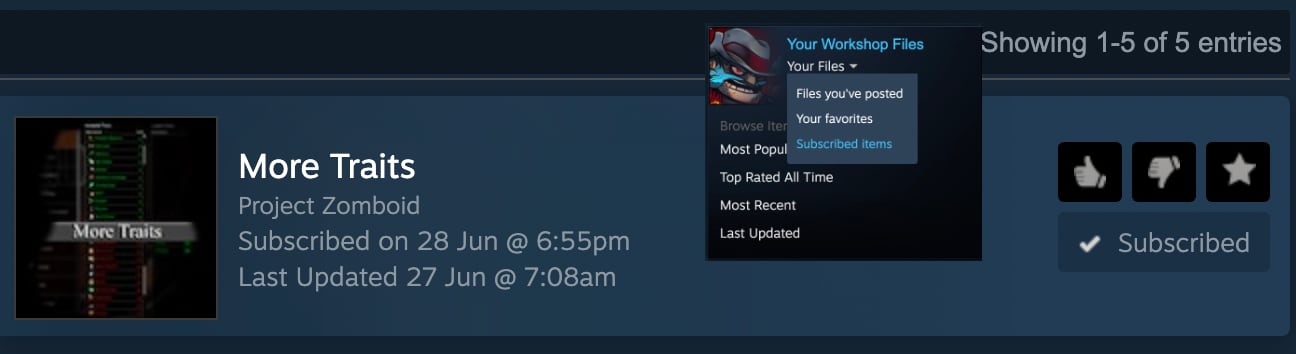 Under Subscribed Items, you’ll see all of the mods that you’re subscribed to (it defaults to the date subscribed, but if you sort by date updated it’ll put the last most recent updates all the way at the top). For example, on 27 Jun some mods were recently updated so those are the ones I need to update.