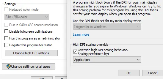 In Windows 10 Version 1703 and later versions of Windows, the text of the Disable display scaling on high DPI settings option is changed to Override high DPI scaling behavior. This allows you to specify how applications should behave when displayed on a device with a high DPI setting. Scaling will be performed by the application.